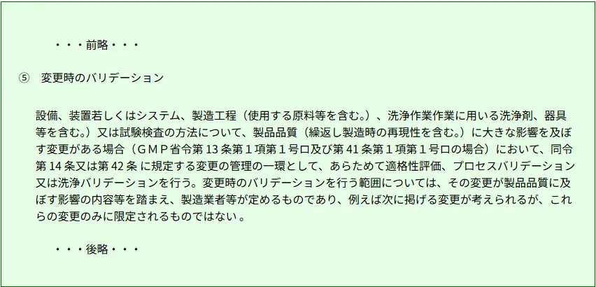 - 「 GMP省令 」 では 「 変更時のバリデーション 」 は以下のように定義されています。