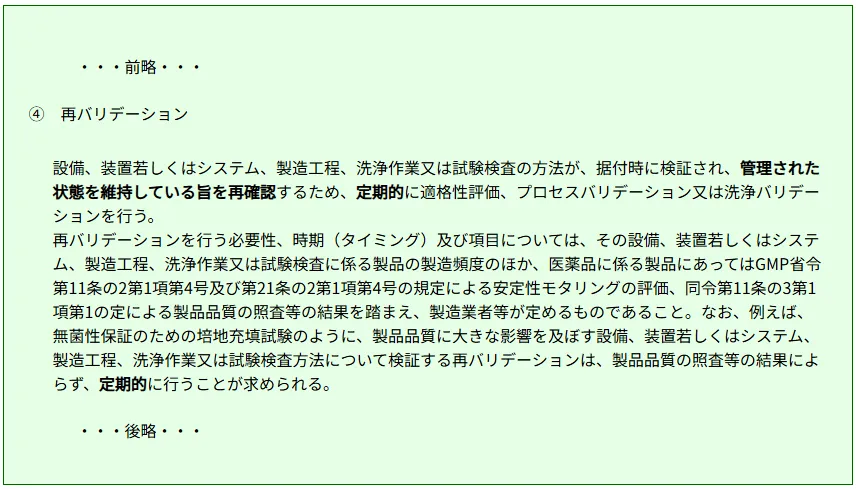 - 「 GMP省令 」 では 「 再バリデーション 」 は以下のように定義されています。