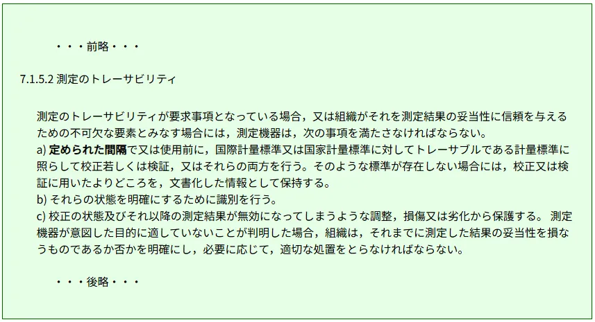 - JIS Q 9001:2015(ISO 9001:2015)品質マネジメントシステム−要求事項に 「 再校正 」 という言葉は使われていませんが、7.1.5.2 測定のトレーサビリティには、定められた間隔で校正や検証を行うことと記されており、繰り返し再度行うという意味でここでは 「 再校正 」 と呼びます( 各関連する仕様が変わらない限り基本的に同じ条件で 「 校正 」 を繰り返す、という重要な意味も 「 再校正 」 に含めています )。