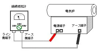 2.電気炉の電源端子とアース端子に、絶縁抵抗計のプローブを接続し