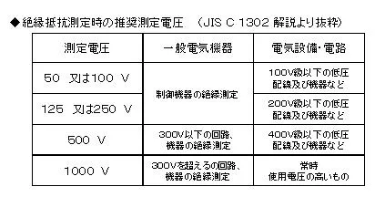 • また、一般的な電気機器の絶縁抵抗を検査する場合の推奨測定電圧は JIS C 1302で決められています。機器の定格電圧等を確認して測定電圧を決めてください。