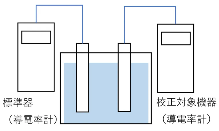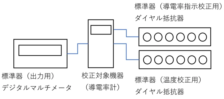 - 当社の校正方法は、基準の導電率計と対象機器を比較する【 比較校正 】とダイヤル抵抗器で模擬的に信号を入力する【 模擬入力校正 】の2つに分類することが出来ます。