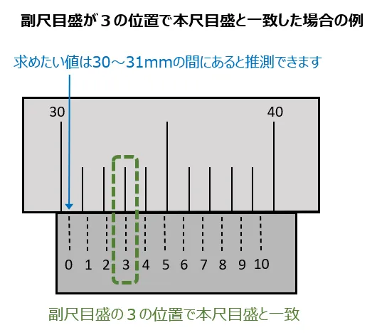• 従って、本尺の読みに 0.3( = 3/10 )を加えた値である、 30.3mm となるので、 0.1mm の単位まで細かく読む事ができるようになります。