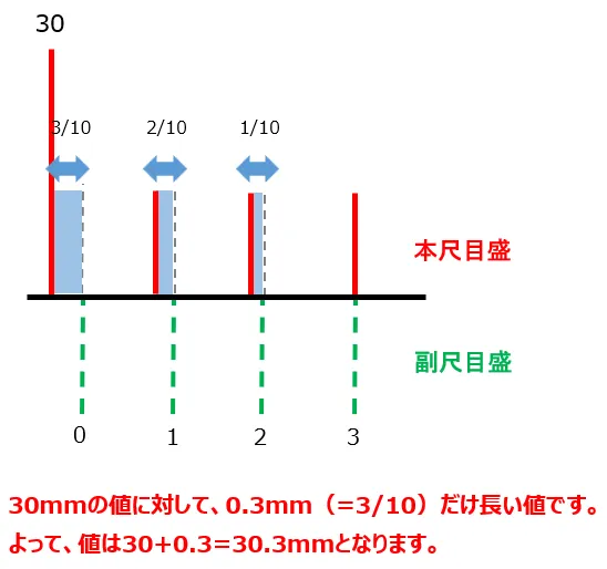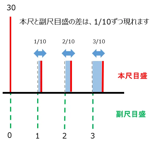 • いま、副尺の目盛の3の位置で本尺と副尺の目盛が一致しているとした場合、その左隣の本尺と副尺の目盛は 1/10 だけずれます。同様に、その左隣は 2/10 、…とそれを繰り返し、副尺のゼロの位置では 3/10 ずれている事になります。