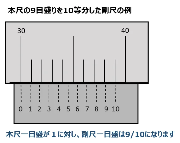 • 今回、わかりやすい事例として本尺の9目盛りを10等分した副尺を使って説明します。